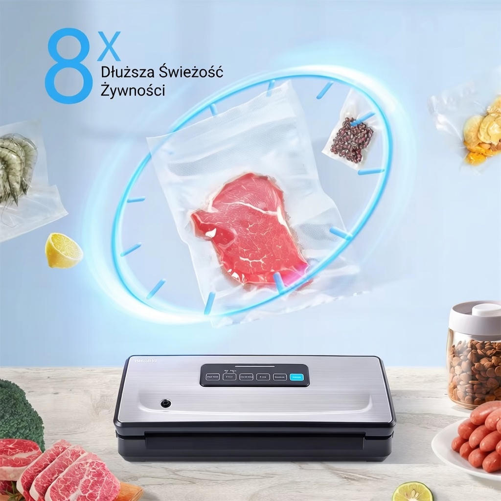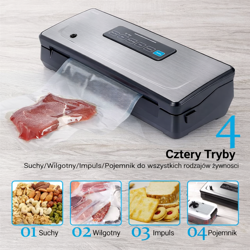 - Wydajna pompa próżniowa (-85kPa): Dzięki silnikowi wysokiej klasy, urządzenie odsysa powietrze szybko i stabilnie (w ciągu około 20 sekund), zapewniając szczelne zamknięcie.