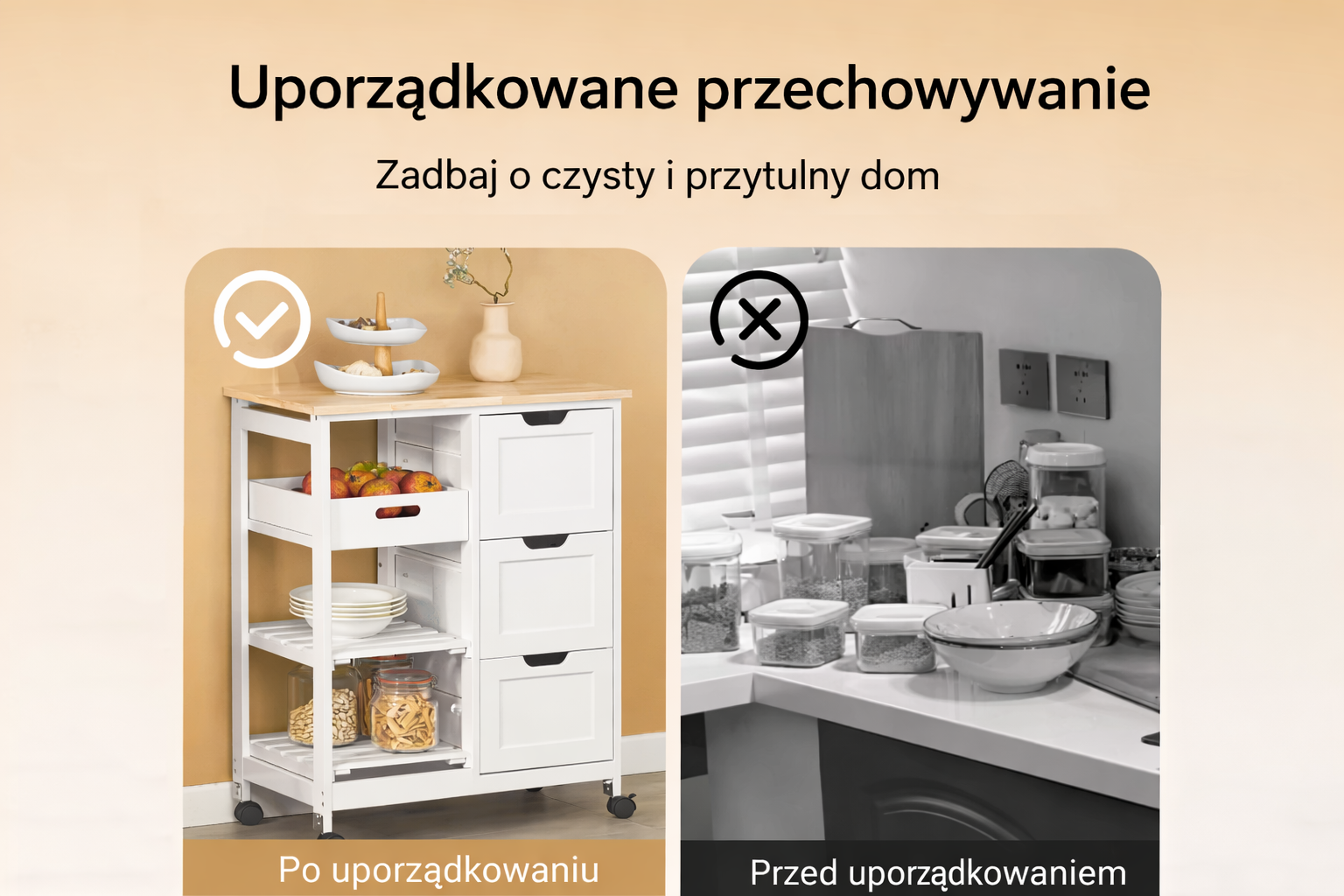 - Pełna mobilność: Dzięki 4 solidnym kółkom wózek płynnie przesuwa się po podłodze. Możesz go łatwo przetransportować z kuchni do jadalni lub salonu.